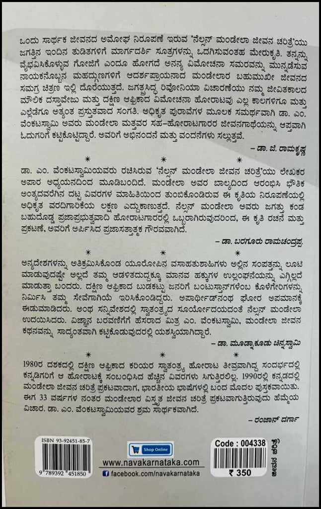 ಡಾ. ಎಂ. ವೆಂಕಟಸ್ವಾಮಿಯವರು ರಚಿಸಿರುವ 'ನೆಲ್ಸನ್ ಮಂಡೇಲಾ ಜೀವನ ಚರಿತ್ರೆ'ಯು ಲೇಖಕರ